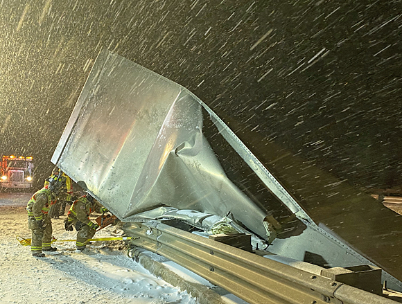 A semi tractor-trailer rig jackknifed Saturday night on U.S. 30, at the overpass with U.S. 127, during the overnight snowstorm. The semi then went through the guardrail and ended up on the embankment of the overpass, spilling approximately 100 gallons of diesel fuel, according to Van Wert County Emergency Management Director Rick McCoy. McCoy, who noted the Van Wert area received 7.8 inches of snow Saturday night through Sunday afternoon, added that a hazardous materials (hazmat) crew will be hired to clean up the spill. Fortunately, the driver was unhurt. Assisting the Van Wert Post of the Ohio State Highway Patrol with the accident was the Van Wert County Sheriff’s Office, county EMA personnel, and Hague Towing. photos by Rick McCoy for the Van Wert independent
