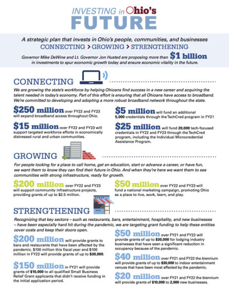 The Investing In Ohio Initiative within the proposed Executive Budget includes $460 million to support Ohio’s small businesses that have been significantly impacted by the COVID-19 pandemic.