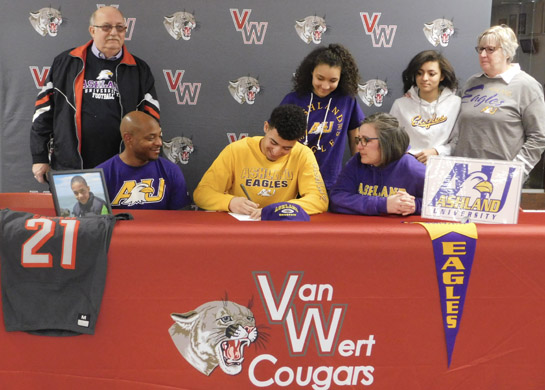 That’s the path taken by Van Wert High School senior Dru Johnson, who signed a letter of intent to play collegiate football at Ashland University this fall. Surrounded by family members, coaches and high school teammates, Johnson put ink to paper during a brief ceremony held Wednesday afternoon as part of National Signing Day.
