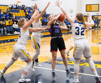 Not even a triple team defense could slow down Crestview’s Olivia Cunningham (23), who finished with 28 points against Lincolnview. Bob Barnes/Van Wert independent