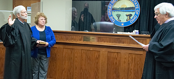 Van Wert County Probate-Juvenile Court Judge Kevin Taylor (left) is being sworn into his second — and last — six-year term by Common Pleas Judge Martin D. Burchfield on Monday. Judge Taylor’s wife, Kathy, holds the bible as her husband recites the oath of office. Dave Mosier/Van Wert independent
