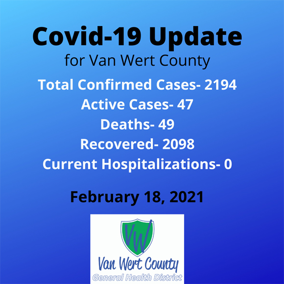 As of Thursday, the Van Wert County General Health District reports an increase of 56 confirmed cases of COVID-19 since Thursday, February 11, for a total of 2,194 confirmed cases. Health officials said they were happy to report no known hospitalizations this week, adding that they appreciate the efforts of the community to help lower the spread of COVID-19.