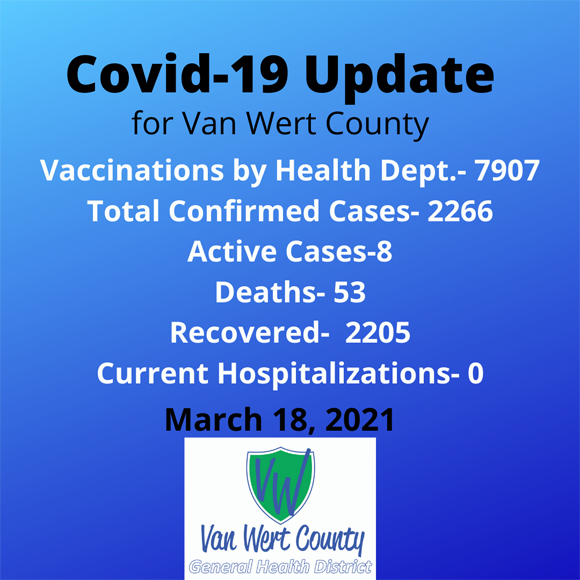To date, the health department has given 7,907 COVID-19 vaccinations. The next walk-in vaccination clinic is Wednesday, March 24, from 2 to 6 p.m., at the Van Wert County Fairgrounds. This clinic will be for those age 40 and above and those with qualifying medical conditions.