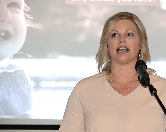 Dayna Motycka speaks at the YMCA’s Good Friday Prayer Breakfast with a photo of her young daughter, Rylee, in the background. Dave Mosier/Van Wert indepdendent
