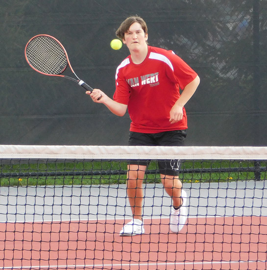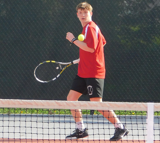 Van Wert’s Jace Fast (above) and Bryce Miller (below) picked up wins during Monday’s match against Bluffton and the Cougars went on to defeat the Pirates 4-1. Fast won at first singles by beating Eden Nygaard 6-2, 6-3, while Miller topped Grant Klinger 6-4, 6-4 at third singles. At second singles, Bluffton’s Luke Shadle defeated Sam Moonshower 6-2, 2-6, 6-1. Van Wert’s first doubles team of Micah Rager and Kaden Thomas beat Bryan Zimmerman and Thad Mittendorf 6-3, 6-3, and the second doubles team of Ian Cowan and Evan Knittle defeated Eli Wenger and Braeden Ackerman 6-2, 7-5. The Cougars (2-2) will play at Defiance today. Scott Truxell/Van Wert independent