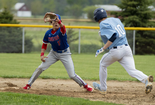Crestview’s Carson Hunter records an out at second base during Tuesday’s non-conference baseball game at Ayersville. Unfortunately for the Knights, the Pilots allowed just one hit, a two-out single by Isaac Kline in the top of the seventh inning, and Ayersville won the game 6-0. Crestview (10-6) is scheduled to host Paulding on Thursday. Photo by Wyatt Richardson/Van Wert independent