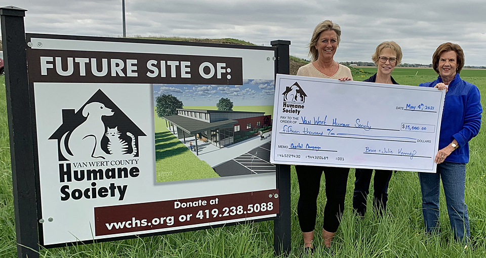 Bruce and Julie Kennedy of Van Wert recently donated to the Van Wert County Humane Society’s capital campaign and their plans for a new shelter/adoption center on Fox Road. Shown above are Michelle White, capital campaign chairperson; Deb Sealscott, VWCHS board president; and Julie Kennedy. “Every stray animal deserves a second chance at finding a good home,” said Mrs. Kennedy. Sealscott added, “We are grateful for those who share our vision for the neglected, unwanted and abused animals in our community.” Others interested in contributing can contact White at michwhite66@gmail.com. Humane Society photo