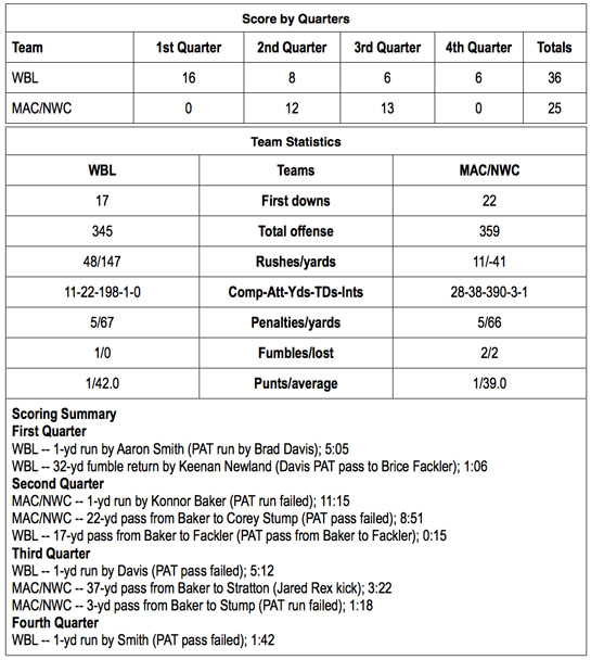 The big-school team increased its lead to 18 points with a 1-yard TD run by Davis with 5:12 left in the third quarter. The MAC/NWC team then scored twice, with the first coming on a 37-yard pass from Baker to Stratton (kick was good by Jared Rex) and the second on a 3-yard pass from Baker to Stump, but still trailed 30-25 heading into the final quarter of play.