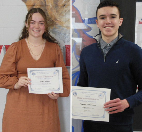 Van Wert Lodge No. 1197, Benevolent and Protective Order of Elks have selected Grace Dowler, a senior at Van Wert High School and Hayden Tomlinson, a senior at Crestview High School as the recipients of the Student of the Month for January. Students are nominated by their high schools to receive this award. Each Student of the Month receives a monetary donation along with a certificate from the Van Wert Elks Lodge 1197 with the possibility to be named the Student of the Year. Students are judged on the basis of multiple achievements – Volunteerism, Character, Leadership, Service, Citizenship and Scholastic. This program is designed to recognize outstanding young men and women for their achievements in school and community. Photos submitted