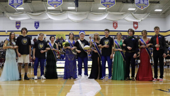 The 2022 Lincolnview Winter Homecoming Court was officially presented before Saturday night’s boys’ basketball game against Paulding. Pictured from left to right are Addysen Stevens, Steve Smith, Garrett Richardson, Una VanWynsberghe, Queen Kendall Bollenbacher, King Avery Slusher, Julia Stetler, Carson Fox, Zada Walker, Cody Kittle, Emma Bowersock and Trace Klausing. Photo courtesy of Hanna Young