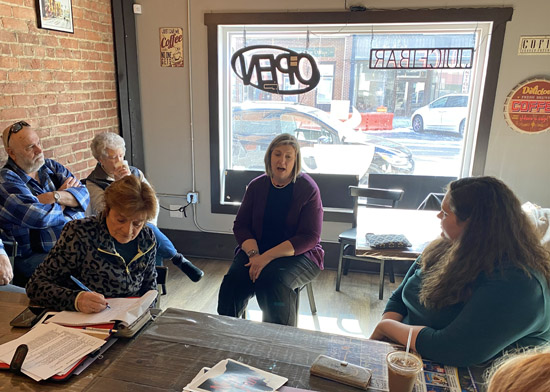 Democratic gubernatorial candidate Nan Whaley (center) visited with Van Wert County Democrats during a campaign stop in downtown Van Wert on Saturday. The former Dayton mayor also made stops in Mercer and Paulding counties. Whaley is running against John Cranley in the primary election and the winner will appear on the November ballot. Scott Truxell/Van Wert independent
