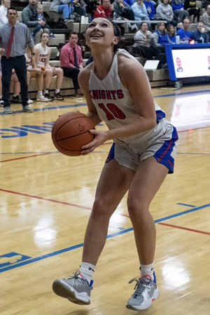 Crestview led 7-6 after the first quarter but opened the second quarter with a 10-2 scoring run, including a triple by Emily Greulach and a steal and layup by Ellie Kline. Cali Gregory added a pair of baskets late in the quarter and the Lady Knights led 21-16 at halftime.