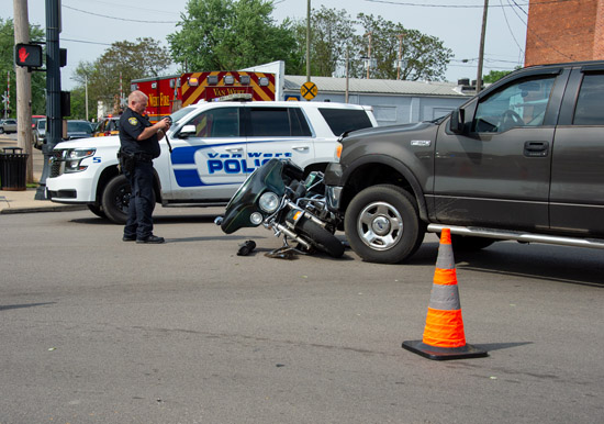 A motorcycle and pickup truck collided at the intersection of W. Main St. and Jefferson St. in downtown Van Wert on Friday. The Van Wert Police Department and Van Wert Fire and EMS were dispatched to the scene shortly before 4:30 p.m. No injuries were reported. Bob Barnes/Van Wert independent