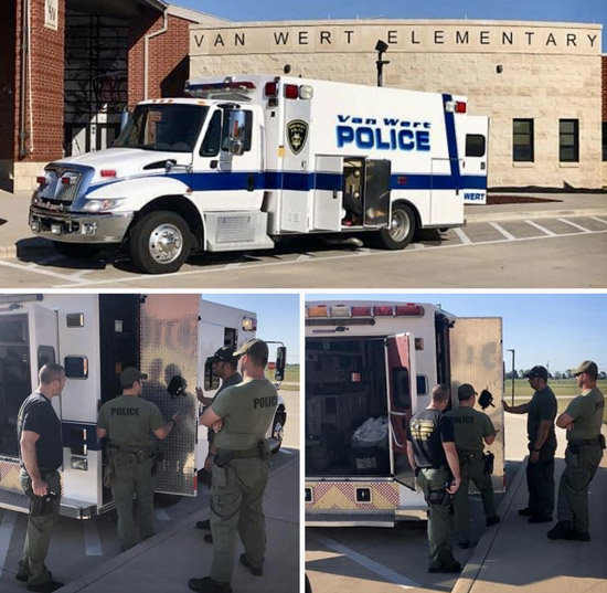 Classes are on break for the summer but the Van Wert Police Department’s Special Response Team spent much of Thursday at school – Van Wert Elementary School. The SRT conducted simulation training inside and outside the building. The training session was coordinated with the Van Wert City Schools. Photos provided