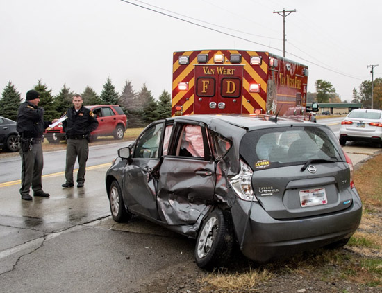 This car was hit by a pickup truck while trying to cross U.S. 224 from Lincoln Highway. It happened at approximately 5:20 p.m. Tuesday, and the driver of the car was taken by ambulance to Van Wert Health. The Van Wert County Sheriff’s Department is investigating the accident. Bob Barnes/VWFD photographer