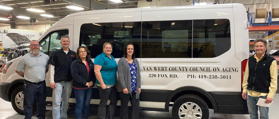 Through a Federal Transit Administration and ODOT Enhanced Mobility Grant, the Van Wert County Council on Aging was awarded a Ford Transit lift equipped van. The Enhanced Mobility Grant helps seniors and individuals with disabilities by removing barriers to transportation service and expands transportation mobility options. This is especially important in rural communities without public transportation. The Council on Aging appreciates Braun Ambulance’s support of this program by providing the lettering on the vehicle. If you know of a Van Wert County senior in need of transportation, they can reach out to the Council on Aging at 419.238.5011. Pictured from left to right are customer care specialists Don Coleman, Mike Moran, Karen Adams and Michelle Tate; Council on Aging Administrative Assistant Samantha Turnwald, and Kip Massoth, Customer Care Team Leader. Photo submitted