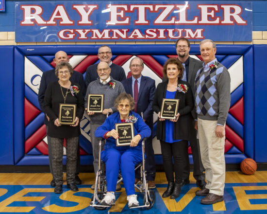 Crestview’s annual Educator Hall of Fame Ceremony was held between the junior varsity and varsity boys’ basketball games on Saturday. This year’s inductees are (front): Carole Simmons-Macklin; middle row – Nancy Speelman, Joseph Plas and Mary Jean Lautzenheiser, who’s children, Tammy Nihiser and Dr. Tom Lautzenheiser, accepted the award. Also pictured (back row, left to right) are Crestview Educator Hall of Fame presenters Bob Motycka, Mike Bowen and Carl Etzler, and Crestview Middle School Principal and presenter Trent Kreischer. Bob Barnes/Van Wert independent