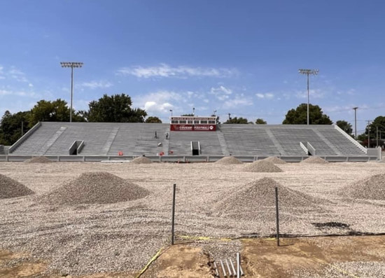 Prep work continues ahead of the installation of new artificial turf at Eggerss Stadium. Among other things, crews are curbing and nailing and preparing for laser grading. Actual turf installation is on track to begin later this month, with completion scheduled for early August. VWCS photo
