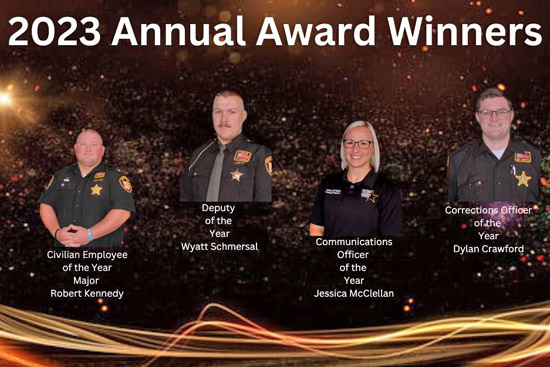The Sheriff’s Office held its 2023 annual awards banquet Saturday at the Elks Lodge in Van Wert. Candidates are nominated and voted on each year by fellow employees. Awards available are Office Citation, Certificate of Merit, Award of Valor, Life Saving Award, Commendation Award, Safe Driving Award, Military Service Award, Civilian Citation, Certificate of Appreciation. In addition, the top four awards are Civilian Employee of the Year, Communications Officer of the Year, Corrections Officer of the Year, and Deputy of the Year. Numerous certificates and awards were issued this year, with the highest four award winners pictured. Photo submitted