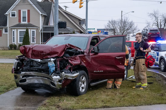 The Van Wert Police Department and Van Wert Fire Department were summoned to the scene of an SUV/semi-truck accident at the intersection of N. Washington St. and Sycamore St. at approximately 10:50 a.m. this morning. According to Lt. Steven Boroff, the semi was northbound and the out-of-state driver failed to stop for a red light, causing the collision with the westbound SUV. The driver of the SUV was treated at the scene by EMS personnel. Bob Barnes/VWFD photographer