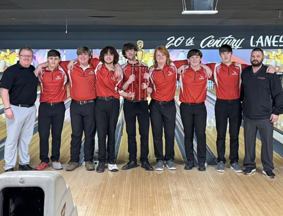 The Van Wert Cougars finished as boys champions of the 2024 Commodore Invitational at 20th Century Lanes in Lima on Saturday. The Lady Cougars finished third. Pictured from left to right are coach Seth Blackmore, Christian Thatcher, Christian German, Logan Sutton, Nevin Pierce, Tristan Blackmore, Hayden Davis, Gavin Springer and coach Jim Davis. Photo submitted
