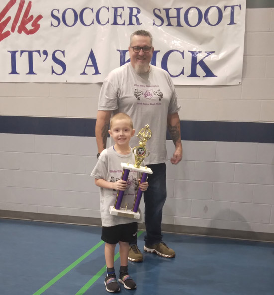 Van Wert Lodge No. 1197, Benevolent and Protective Order of Elks has announced that Everett Gerker, representing Van Wert Elks Lodge and the Ohio Elks Association, placed second in his age group at the recent Elks Regional Soccer contest. Everett competed in the 7 and under division and competed against the winners from the other states in the region. Everett had competed and won the local lodge contest. He then went on to compete at the Northwest District contest held in Findlay as well as the Ohio Elks Association State Soccer Contest where he again placed first. Everett not only represented the local lodge, but the Northwest District and the Ohio Elks Association at the regional contest, which was held on March 1-3, in York, Pennsylvania. Pictured is Everett with Tom Pavlick, State President of the Ohio Elks Association. Photo submitted