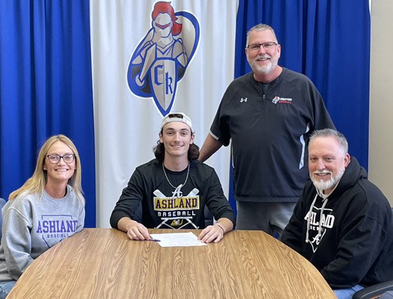 Crestview High School senior Hunter Jones recently signed a letter of intent to continue his academic and baseball careers at Division II Ashland University. Jones is pictured with his mother Trisha, his father Steve and Crestview head baseball coach Jim Wharton. Photo submitted