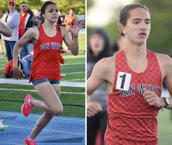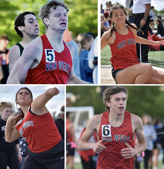 Van Wert’s Macy Johnson (200 meter dash) and Owen Scott (3200 meter run) ran to WBL titles on Friday. Johnson’s time of 25.41 set a new Van Wert High School record. Below (clockwise from top left), Rylan Miller finished second in the 800 meter run, Mia Rager was forth in the long jump, Andrew Laudick placed third in the 3200 meter run and Claire Benner was third in the shot put. Photos courtesy of Monica Campbell