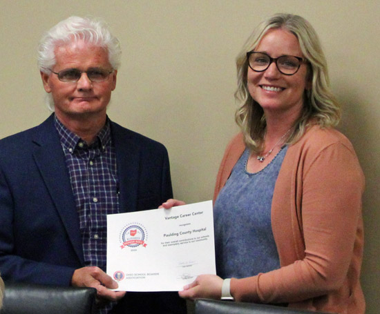 Alexander & Bebout President Sara Zura (above) and Kim Wannemacher, Vice-President of Human Resources at Paulding County Hospital (below) were presented with Ohio School Boards Association (OSBA) Business Honor Roll certificates during Thursday’s meeting of the Vantage Career Center Board of Education. Superintendent Rick Turner presented the awards. Scott Truxell/VW independent