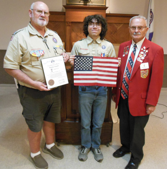 Van Wert Lodge No. 1197, Benevolent and Protective Order of Elks recently participated in the Eagle Scout Court of Honor for Wesley Vaughn, who is a member of Boy Scout Troop 31, sponsored by the First United Methodist Church in Van Wert. Vaughn was presented an American flag and an Eagle Scout Certificate from the Van Wert Elks Lodge. He also received a letter of commendation and a special citation from Randy P. Shook, Grand Exalted Ruler/National President. His Eagle Scout project was the renovation and construction of a memorial garden at the Van Wert Council on Aging. Pictured from left to right are Greg Amstutz, Black Swamp Council Representative, Eagle Scout Wesley Vaughn and Michael C. Stanley, Lodge Scouting Liaison. Photo submitted