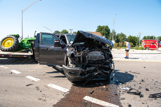 This pickup truck hauling a trailer with a tractor on it was hit by a semi-truck at the U.S. 127/U.S. 224 roundabout late Thursday morning. The pickup and the trailer sustained heavy damage, while the tractor appeared to have sustained notable damage as well. Van Wert EMTs were called to the scene but their services were declined. The crash was investigated by the Van Wert Post of the Ohio State Highway Patrol and traffic control was provided by CERT. Bob Barnes/VWFD photographer