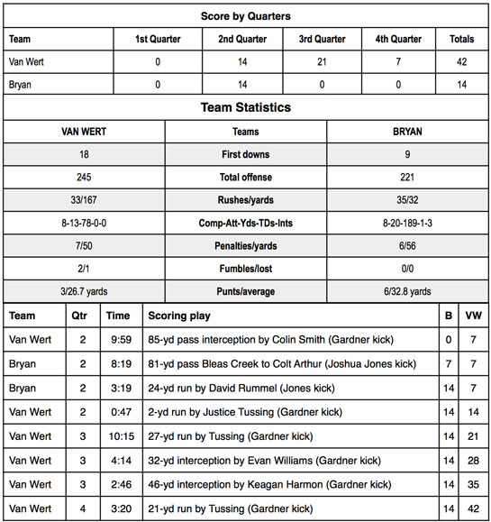 After the Cougars had to punt the ball away, the Golden Bears took their only lead of the game on their next possession when David Rummel ran 24 yards for a touchdown to make it 14-7. But that was the last score of the game for Bryan, as Van Wert rattled off 35 unanswered points.