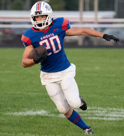 Braxton Leeth reached the end zone five times and finished with 128 yards and five touchdowns on 20 carries, while Zayden Martin accounted for 91 yards and a touchdown on 14 carries, as the Knights (1-0) finished with 285 yards on the ground, all behind an offensive line with five new starters.