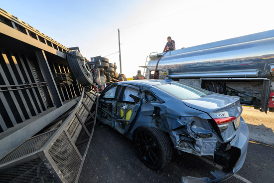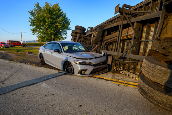 U.S. 127 at Wren Landeck Road was closed for about three hours this morning after a semi-truck and car collided at the intersection at approximately 7:45 a.m. The Van Wert Post of the Ohio State Highway Patrol is handling the crash investigation and said the trucker, from Bradenton, Florida, was following the car too closely and swerved when the driver, from Urbana, Ohio, slowed to make a turn, hitting the car as it was turning. The rig then flipped onto its side. Both drivers suffered minor injuries. Ohio City Fire and Rescue units were also at the scene, along with Van Wert County Sheriff’s deputies and Van Wert County CERT. Bob Barnes photos