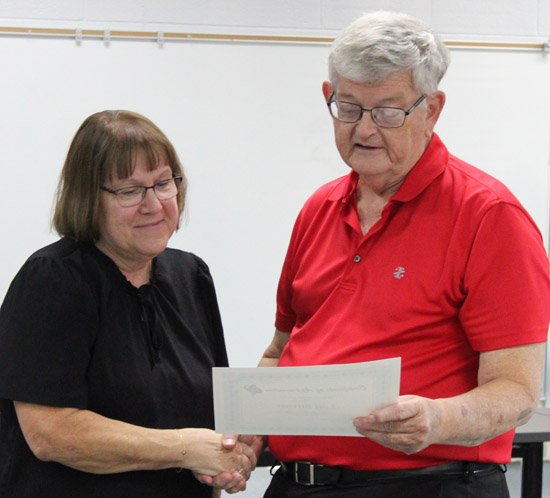 Crestview Local Schools Board of Education member Lori Bittner was recognized for 15 years of service during Monday night’s school board meeting. She was presented with an OSBA (Ohio School Boards Association) certificate by Board President John Auld. Scott Truxell/Van Wert independent