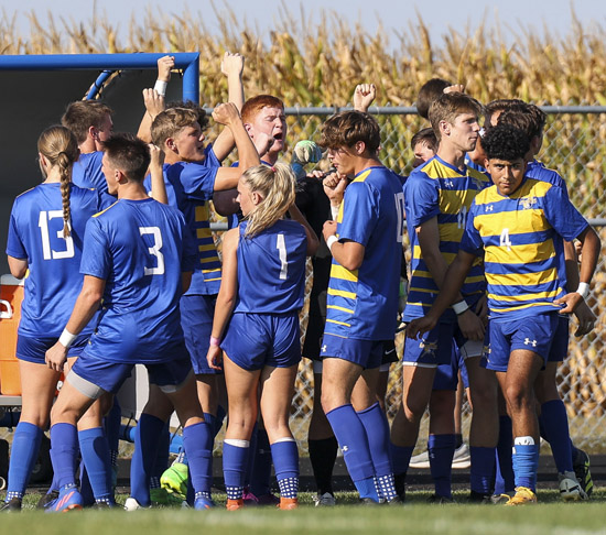 Lincolnview celebrates after defeating Lima Central Catholic 4-0 in NWC soccer action on Monday. A goal by Jakeb Frysinger from 25-feet out gave the Lancers a 1-0 halftime lead, then Lincolnview added three more goals in the second half – headers by Conlan Hatfield and Brayson Davis, and an 18-footer by Caleb Buehrer. The Lancers (2-6-2) will travel to Continental today. Photo courtesy of Wyatt Richardson