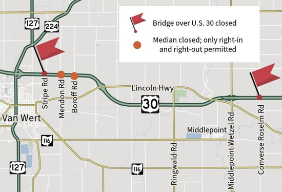 Work is underway to repair U.S. 30 overpasses along Stripe Road in Van Wert and Converse Roselm Road in Middle Point. Both overpasses were closed in May due to damage caused by an over-height vehicle. U.S. 30 is restricted to one lane in the work zones. Starting Friday, September 20, the median at Mendon Road and Boroff Road will close and remain closed during repairs. Traffic will be restricted to right-in, right-out movement only.