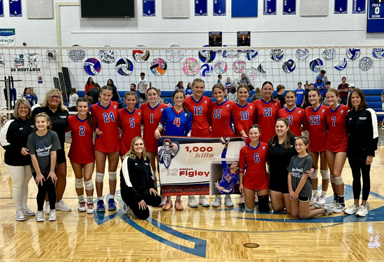 Adelyn Figley (12) of Crestview and her teammates celebrated a notable milestone Thursday night. Figley reached and surpassed 1,000 career kills and the 10th ranked Lady Knights defeated Allen East in straight sets. Photo submitted