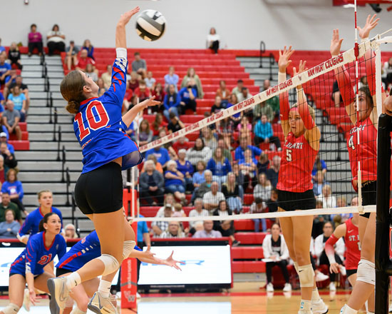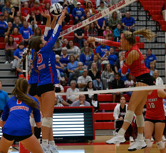 No. 9 Crestview and No. 2 St. Henry met in the nightcap of Monday’s Division VI district semifinal match at Van Wert High School. Unfortunately for the Knights. St. Henry’s was too much, as the Redskins posted a 25-20, 25-7, 25-12 victory. Crestview’s season ended at 19-5. St. Henry will face No. 1 Coldwater in the district finals at 6 p.m. Wednesday at Van Wert. Coldwater swept Marion Local in the first match of the night. Bob Barnes/Van Wert independent