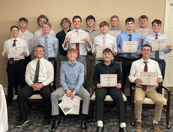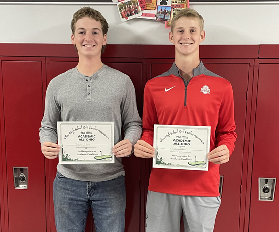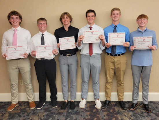 The Van Wert High School golf team recently held its banquet at Willow Bend Country Club. Shown above are the team’s scholar-athletes. 100 percent of the team earned the award. Shown immediately below are varsity letter winners Hayden Dowler, Trevor Halker, Sam Houg, Brock Stoller, Keaton Foster, and Griffin McCracken. Not pictured are Carter Wright and Zach Stoller. The third picture shows Academic All-Ohio winners Hayden Dowler and Keaton Foster. Photos submitted