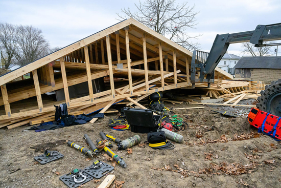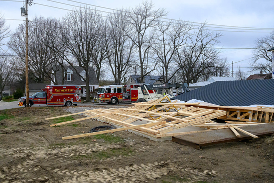 A home under construction collapsed and trapped a worker in the 1100 block of Park St. in Van Wert just before noon today. Fire and rescue units from Van Wert responded to the scene and a materials handler at the site was used along with an EMT airbag lift system to free the worker. The fire department performed advanced life support treatment and the worker was transported to OhioHealth Van Wert Hospital, then was airlifted to Parkview Regional Medical Center in Fort Wayne. The cause of the collapse is under investigation, but it’s believed windy conditions may have been a factor. Bob Barnes/VWFD photographer