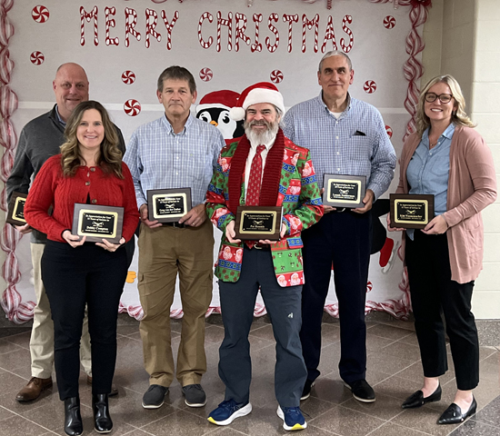 During Thursday’s Vantage Career Center Board of Education meeting, Superintendent Rick Turner honored members who have been on the board for at least 10 years and presented each one with a plaque. Shown above are (front row) Debby Compton (Van Wert, 11 years) and Pat Baumle (Wayne Trace, 13 years). Back row (left to right): Dennis Recker (Antwerp, 13 years); Greg von der Embse (Kalida, 13 years); Lonnie Nedderman (Crestview, 20 years), and Kim Wannemacher (Ottoville, 11 years). Scott Truxell/Van Wert independent