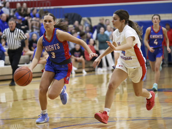 Crestview’s Kaci Gregory (3) leads the break during Thursday’s NWC basketball game vs. Lima Central Catholic. Gregory finished with a game high 23 points and the Lady Knights soundly defeated the Thunderbirds 66-3. Crestview led 45-0 at halftime. Peyton Hoffman added 10 points and all Lady Knights scored in the game. Crestview (3-1, 1-0 NWC) will host Delphos St. John’s in a varsity-only game at noon on Saturday. Wyatt Richardson/Van Wert independent