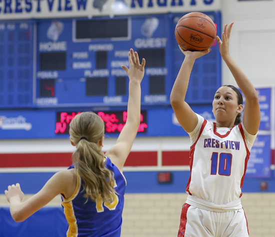 Haley McCoy (10) goes up for a shot during Saturday’s game against Delphos St. John’s. McCoy and the Lady Knights improved to 4-1 with a 58-26 victory over the visiting Blue Jays. Ellie Kline led Crestview with 11 points and Kaci Gregory added 10. Crestview will host Spencerville on Thursday. Wyatt Richardson/Van Wert independent