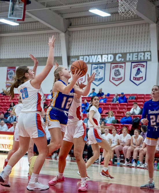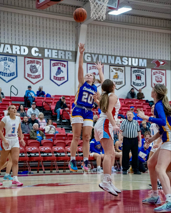 The 1-2 punch of Lincolnview’s Keira Breese (12, above), and Emerson Walker (20, below) proved to be too much, as the Lancers defeated Lima Central Catholic 64-40 on Thursday. Check the recap below for more details. Photos courtesy of Hanna Young