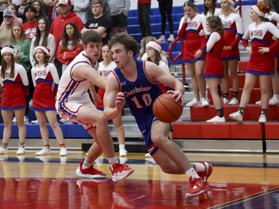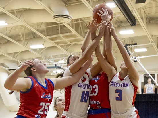 Many hands go up for a rebound during Saturday afternoon’s Wayne Trace at Crestview girls basketball game. Below, Crestview’s Tommy Heffner (10) drives the baseline during the boys’ matchup between the two schools. A recap of both games can be found above. Wyatt Richardson/Van Wert independent