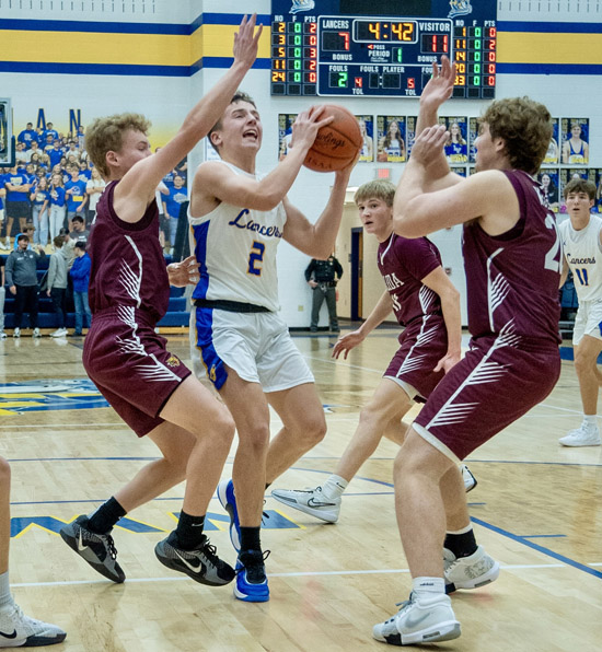 Lincolnview guard Max Hammons (2) finds himself surrounded by Kalida defenders on Friday night. Unfortunately for the Lancers, the Wildcats went on a big second quarter run and left with a 69-53 victory. A full game story and more can be found on the Sports page. Photo courtesy of Hanna Young