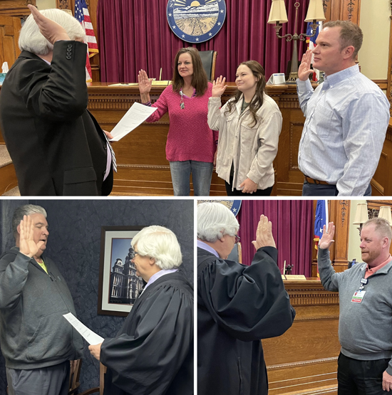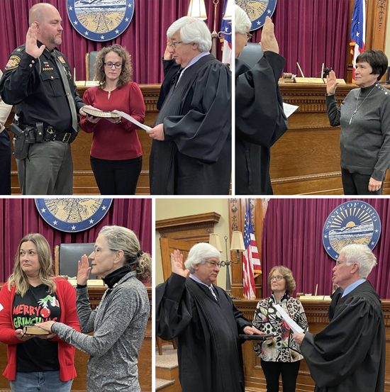 Local public officials and employees were sworn in at the Van Wert County Courthouse Friday morning. Among those taking the oath of office (above): Sheriff Tom Riggenbach, Clerk of Courts Cindy Mollenkopf, Prosecuting Attorney Eva Yarger and Common Pleas Court Judge Martin D. Burchfield, who was sworn in by Probate/Juvenile Court Judge Kevin H. Taylor. Shown below are Probation Officer Stacy Widmer, Probation Clerk Sydney Abromavich, and Chief Probation Officer Steve Wiechart; County Engineer Kyle Wendel, and Coroner Scott Jarvis. Photos submitted