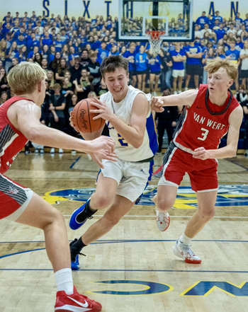 Lincolnview’s Max Hammons (2) tries to drive by Van Wert’s Zach Crummey (left) and Griff McCracken (3). Photo courtesy of Hanna Young