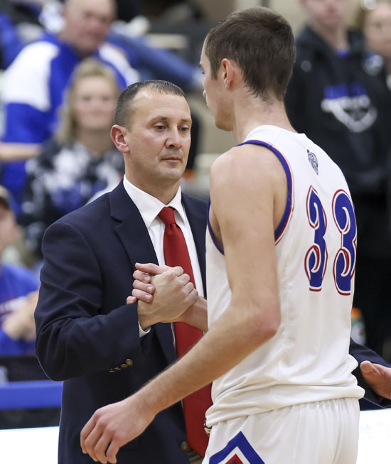 Crestview head coach Doug Etzler congratulates Wren Sheets after the 6-6 senior post player joined the 1,000 point club during Friday’s game against Allen East. Sheets scored 18 points and the Knights won the game 61-48. See recap below. Wyatt Richardson/Van Wert independent